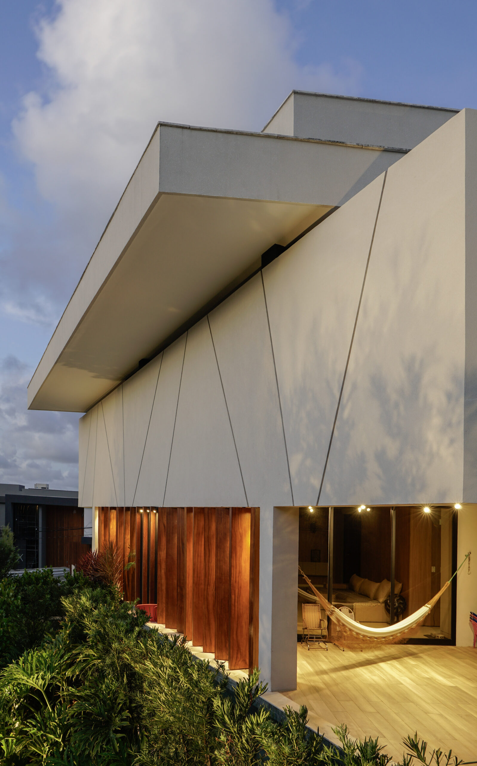 O paisagismo ao redor foi pensado para oferecer privacidade à área de lazer, enquanto a piscina, posicionada ao longo do lote junto à edificação, atende perfeitamente às práticas de natação da família. Na lateral da casa, o protagonismo fica por conta dos brises verticais, robustas peças pivotantes de madeira projetadas para serem ajustadas, permitindo o controle do vento ou da sombra na medida certa no terraço gourmet.