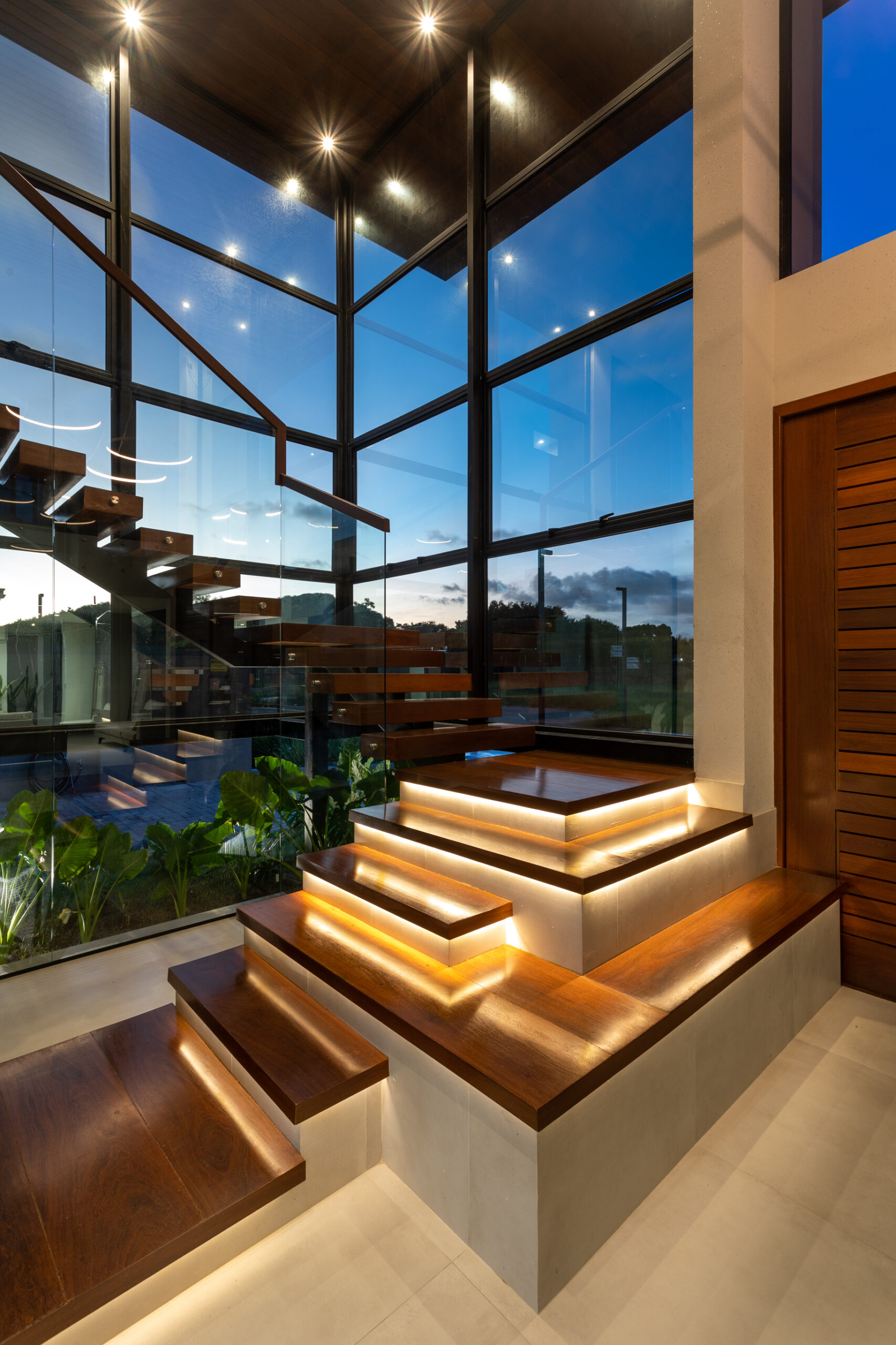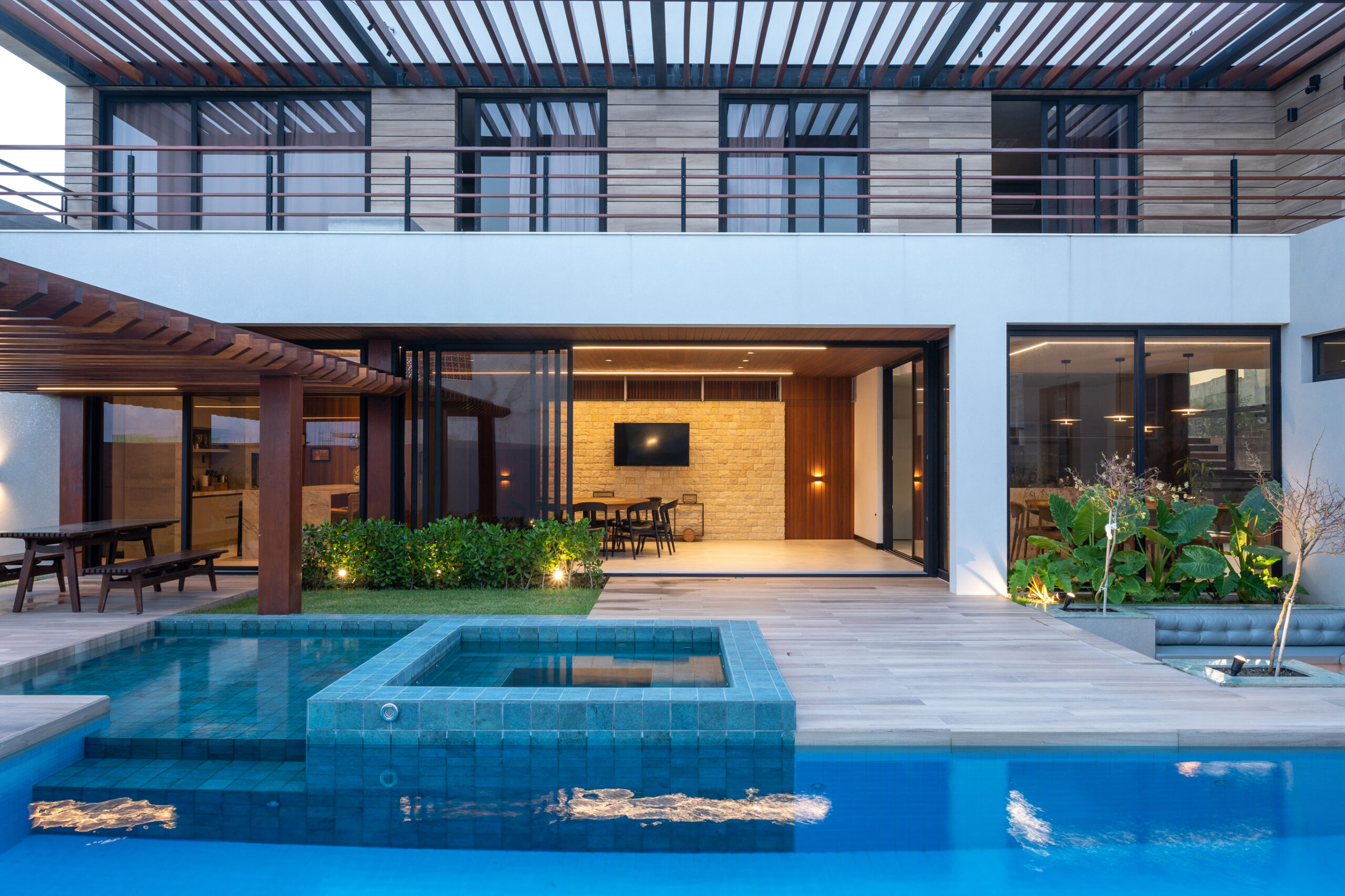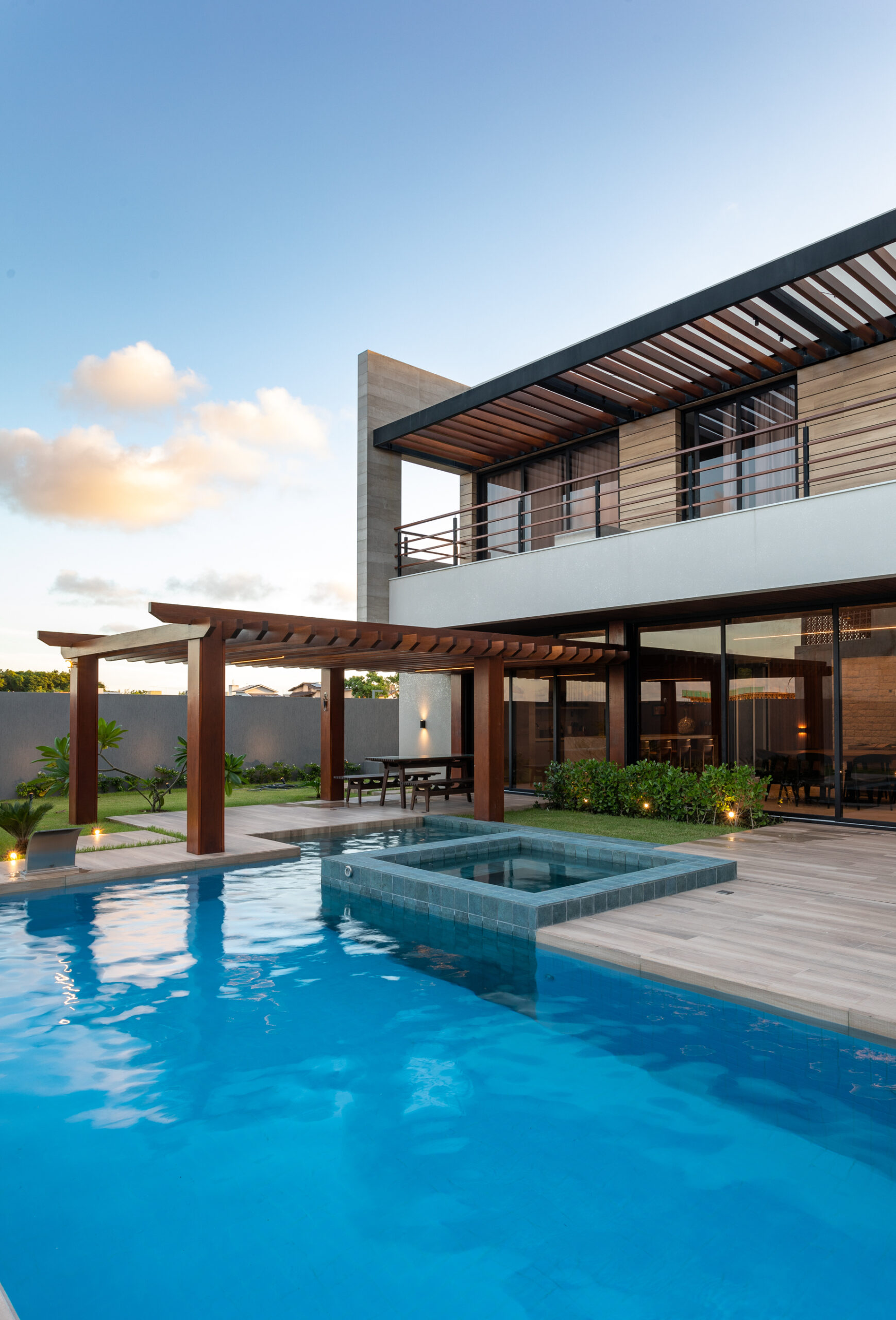 Nosso objetivo foi projetar um espaço que integrasse sofisticação e funcionalidade. Para isso, buscamos uma combinação harmoniosa de materiais: o concreto trouxe solidez, a madeira adicionou calor e acolhimento, e o vidro proporcionou um toque moderno, além de estabelecer uma conexão visual com o ambiente externo. Dedicamos especial atenção à área de lazer, onde criamos uma integração planejada entre o terraço gourmet, a piscina e o jardim, resultando em uma atmosfera de tranquilidade. A hidromassagem embutida na piscina elevou ainda mais o nível de conforto e luxo do espaço, tornando-o um convite irresistível ao lazer e ao relaxamento, perfeito para reuniões entre amigos e momentos de convivência familiar.