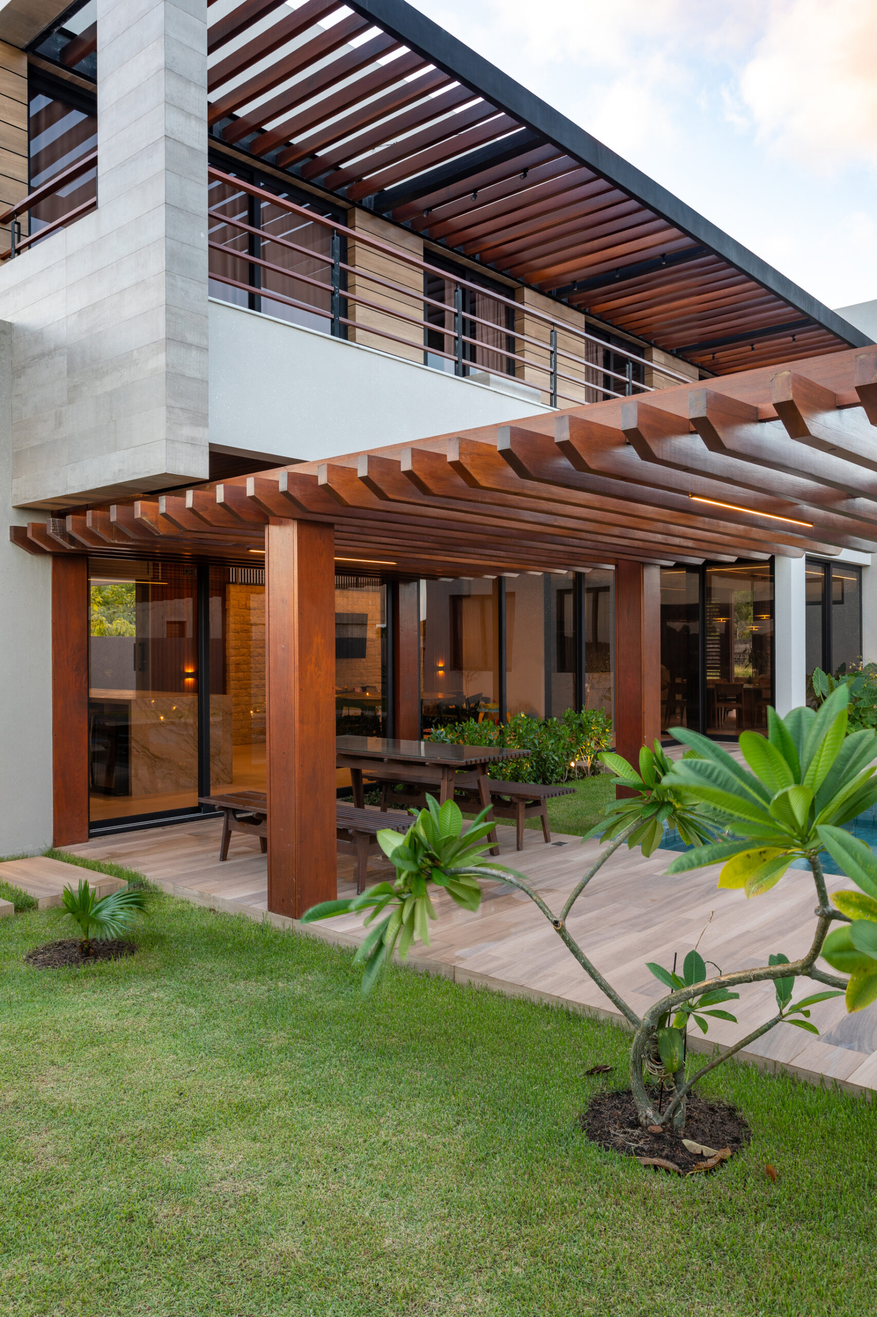 Projetamos a varanda semicoberta com pérgolas minimalistas para permitir a entrada de luz solar de forma controlada, garantindo equilíbrio e bem-estar. Além disso, as grandes portas de vidro deslizantes foram pensadas para ampliar a conexão entre os espaços interno e externo, maximizando a luminosidade natural e a sensação de amplitude. Esse projeto representa nosso compromisso com um design que dialoga com a modernidade, sem perder a conexão profunda com a natureza e o bem-estar dos moradores. Foi assim que transformamos ideias em realidade e criamos um lar que reflete a identidade daqueles que o habitam.